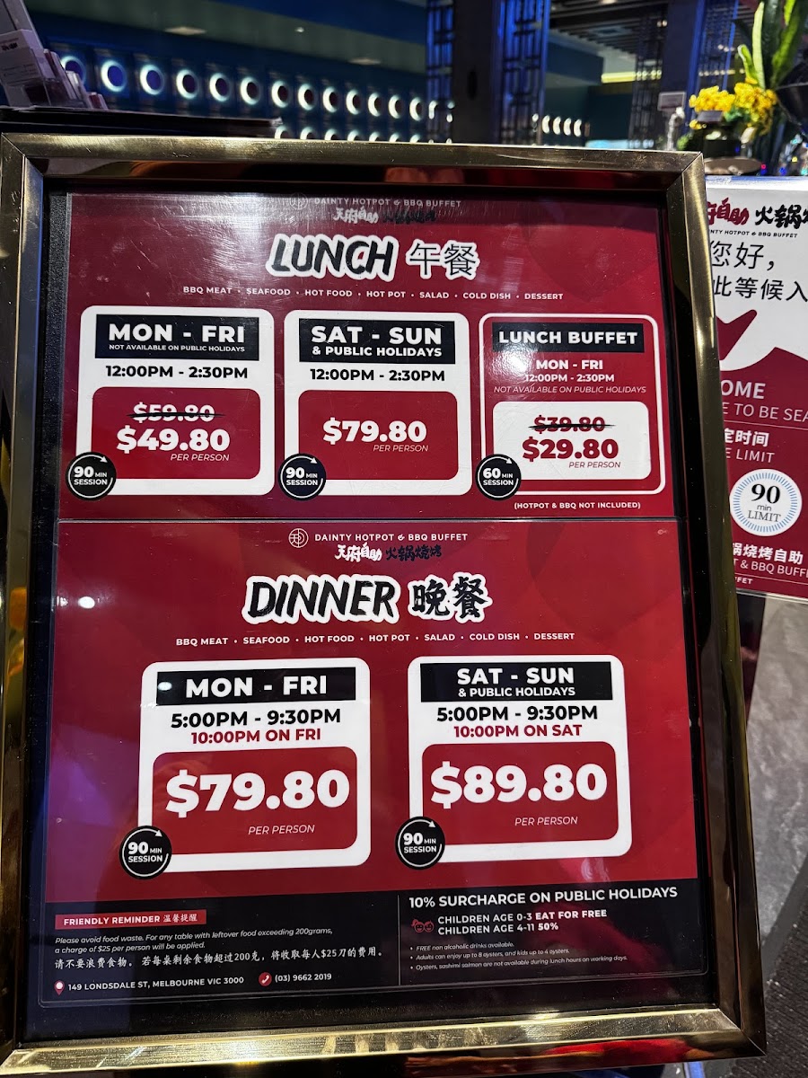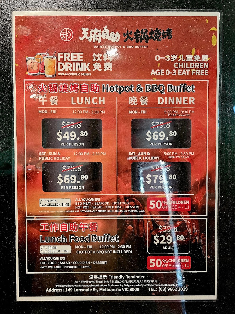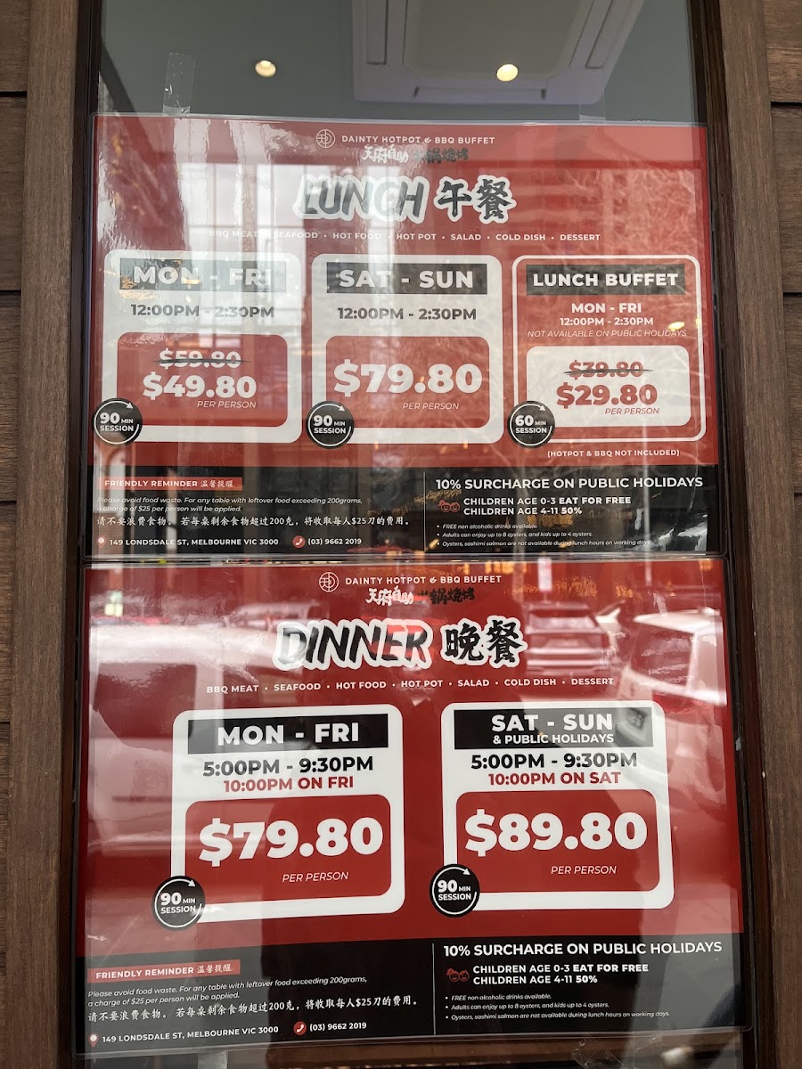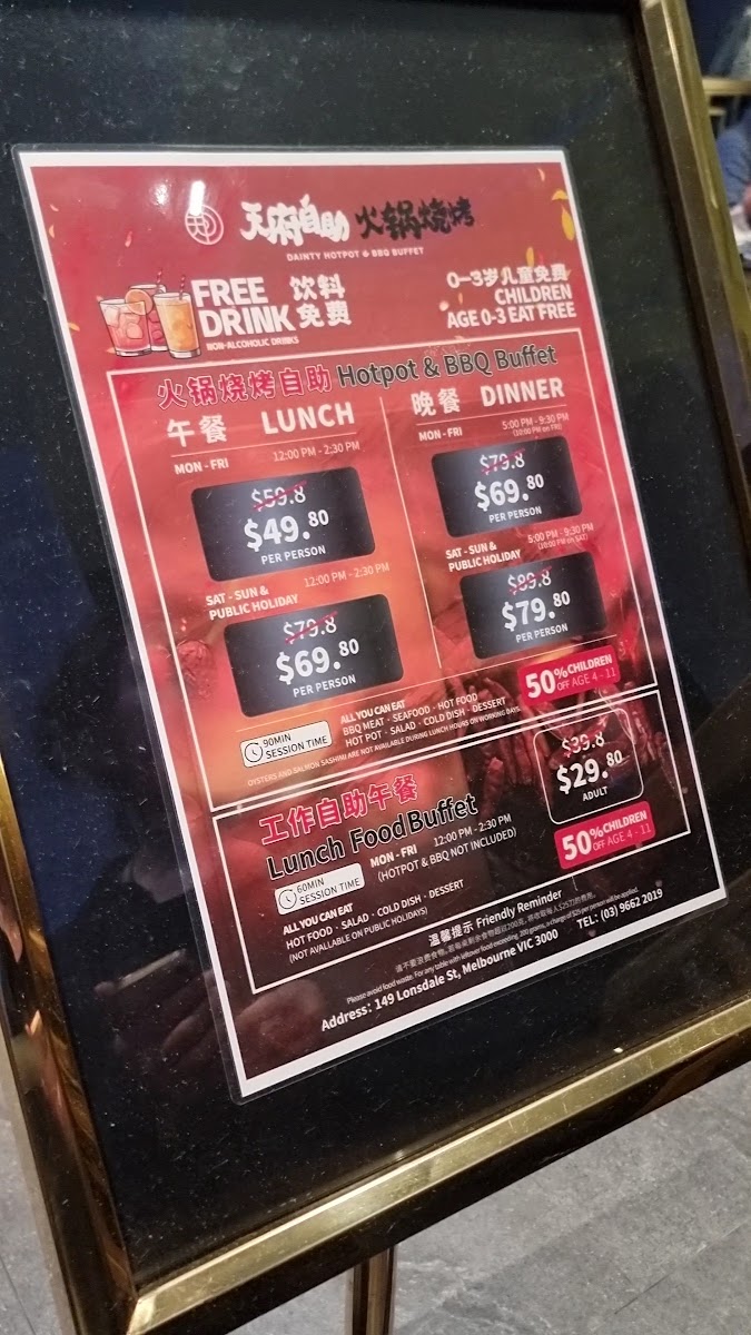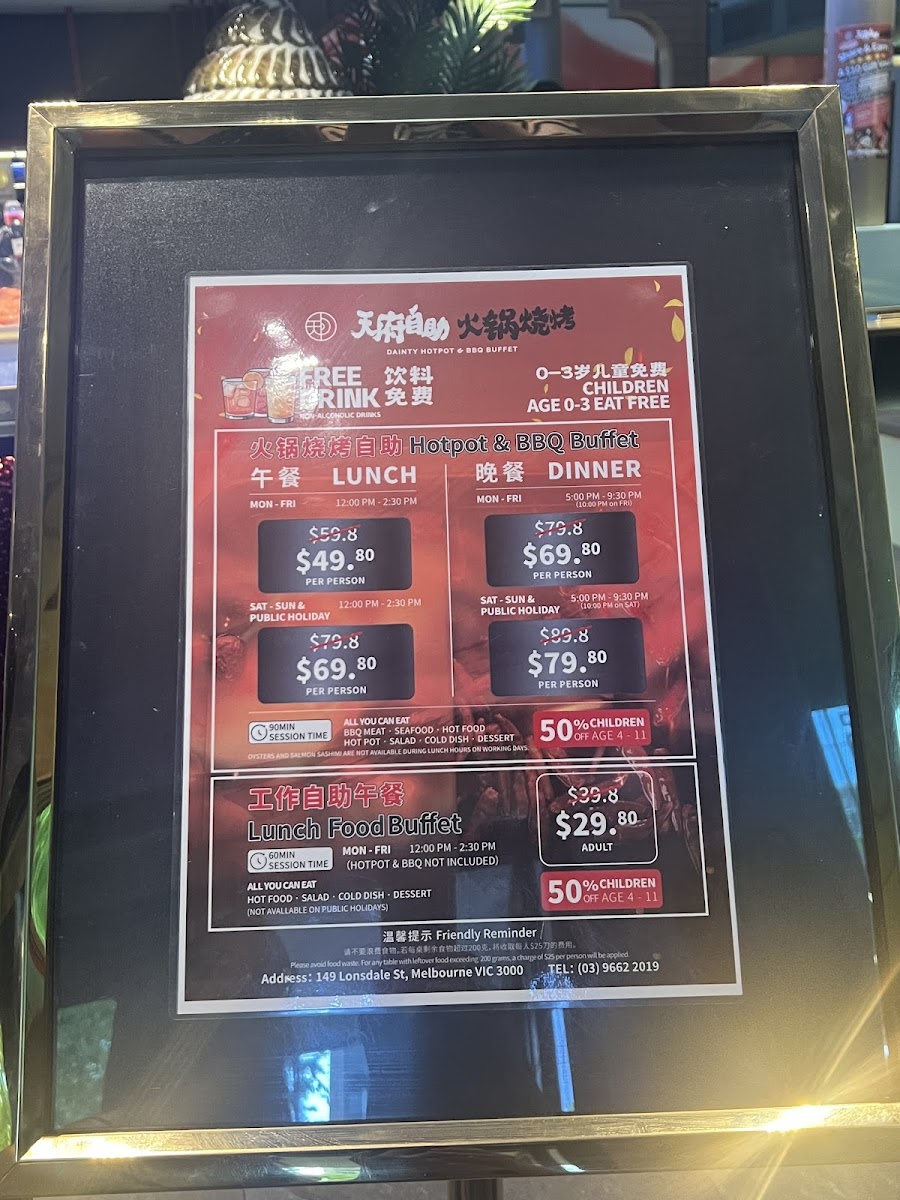 Welcome to Dainty Hotpot & BBQ Buffet menu, where culinary adventure awaits at every turn! Located at 149 Lonsdale St, Melbourne VIC 3000, we're proud to present a menu packed with delightful specialties that cater to all palates. Dive into our signature Double Hot Pot, offering a symphony of flavors sure to tantalize your taste buds. Take your dining experience up a notch with our sumptuous Sliced Beef and a delightful Fondue Station that brings a fun twist to your meal. Seafood lovers will rejoice over our fresh Prawns, while our Mushroom Combo and Hot Pot Misc items bring a burst of flavor and variety to your feast. Don’t forget to indulge in our famous Lava Bao for a sweet finish! Come join us and make your meal a memorable feast!