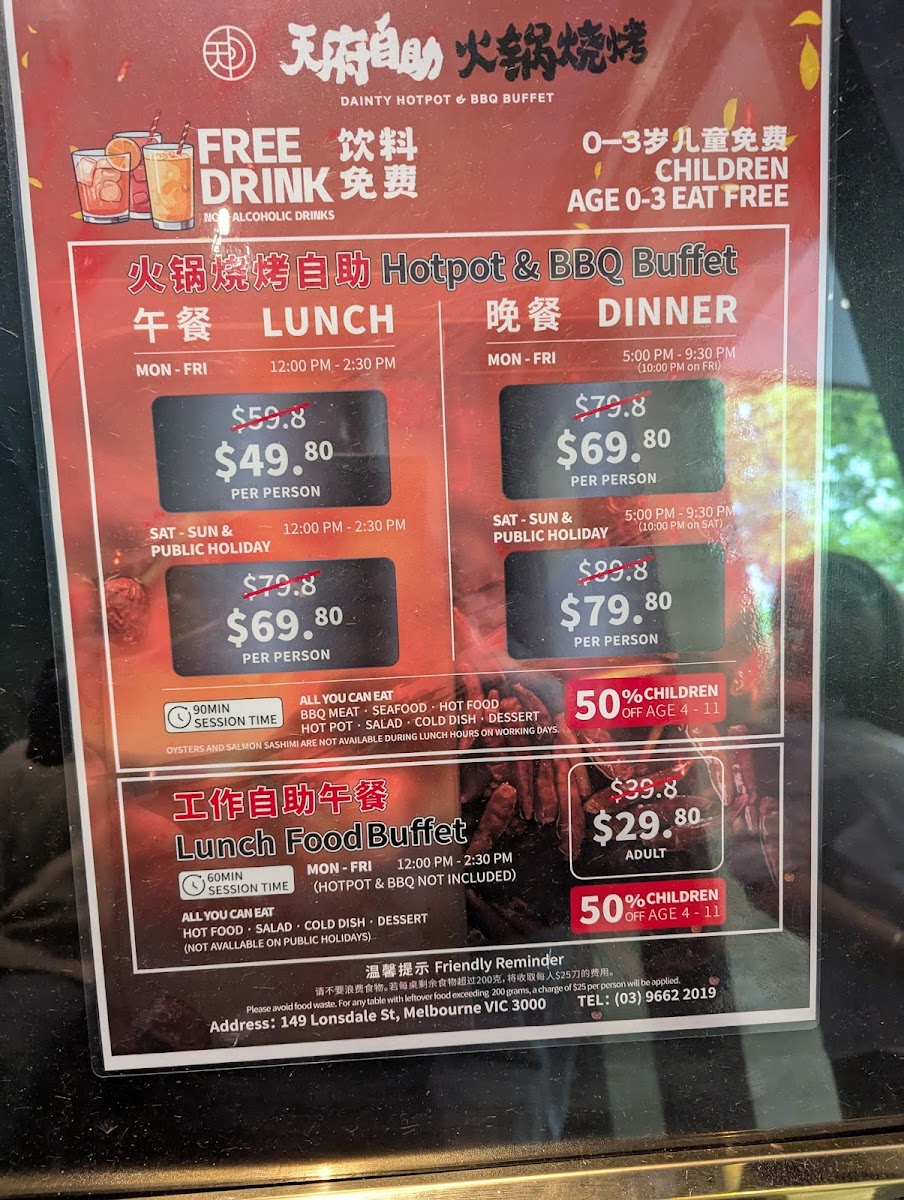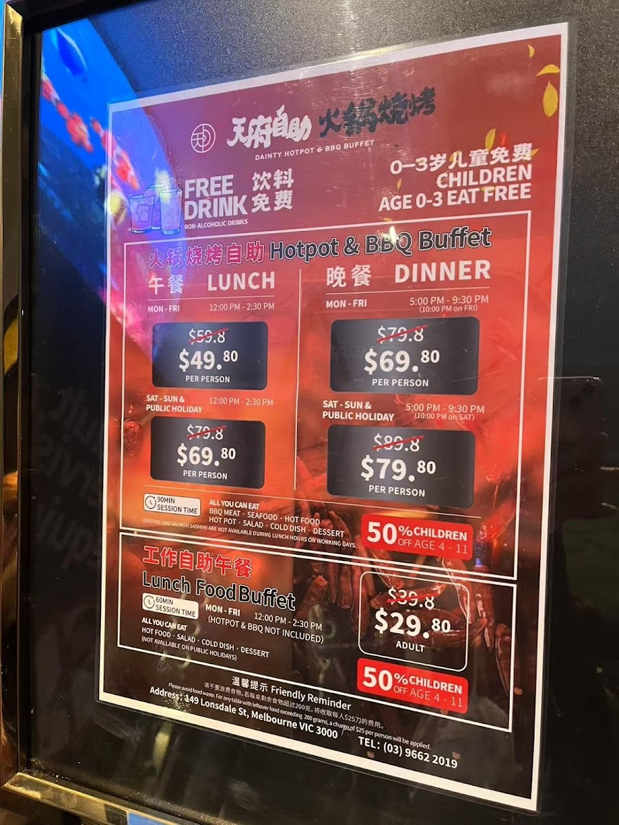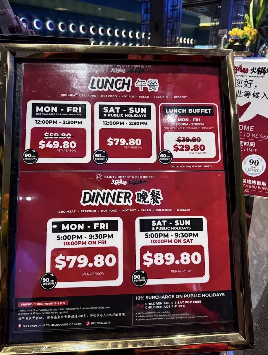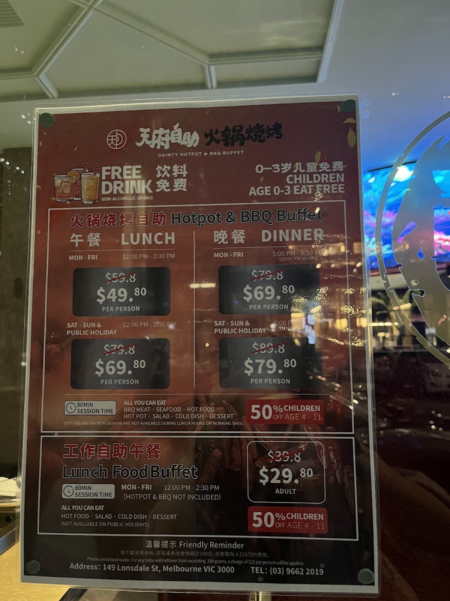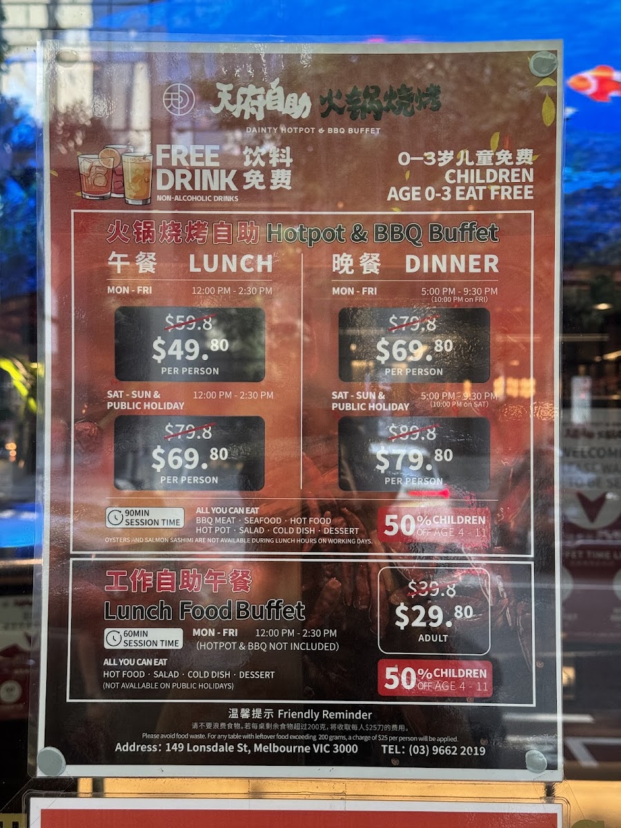 Welcome to Dainty Hotpot & BBQ Buffet menu, where culinary adventure awaits at every turn! Located at 149 Lonsdale St, Melbourne VIC 3000, we're proud to present a menu packed with delightful specialties that cater to all palates. Dive into our signature Double Hot Pot, offering a symphony of flavors sure to tantalize your taste buds. Take your dining experience up a notch with our sumptuous Sliced Beef and a delightful Fondue Station that brings a fun twist to your meal. Seafood lovers will rejoice over our fresh Prawns, while our Mushroom Combo and Hot Pot Misc items bring a burst of flavor and variety to your feast. Don’t forget to indulge in our famous Lava Bao for a sweet finish! Come join us and make your meal a memorable feast!